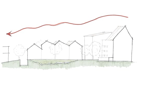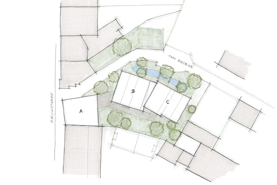 En étroite collaboration avec BuroBuiten, IMPULS(E) a conçu une zone verte à circulation réduite qui relie les trois bâtiments. Les résidents accèdent à leur maison par une petite place commune, où les passants peuvent également se reposer un instant sur un banc. Une différence dans les pavés en béton marque subtilement la transition entre la rue et la cour résidentielle, ce qui incite les voitures à ralentir naturellement. L'aménagement vert – avec un wadi, des plantations et des endroits pour s'asseoir – invite à la rencontre et contribue à la qualité de vie du projet et de la rue.